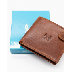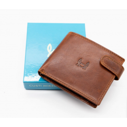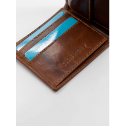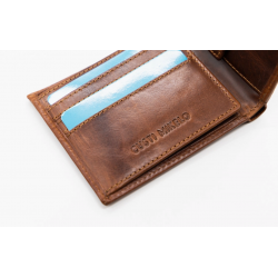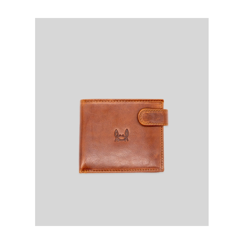 Portefeuille confectionné en 100 % cuir de vachette huilé. Il est doté d'une fermeture à bouton-pression. Il dispose de compartiments pour billets, cartes et pièces de monnaie. Logo gravé à l'extérieur et à l'intérieur. Dimensions 9x11 cm.