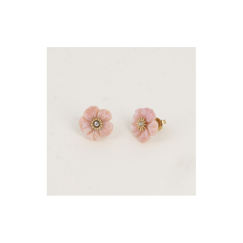 Boucles d'oreilles à puce en acier inoxydable composées d'une fleur nacrée embellie par un petit cristal taillé.