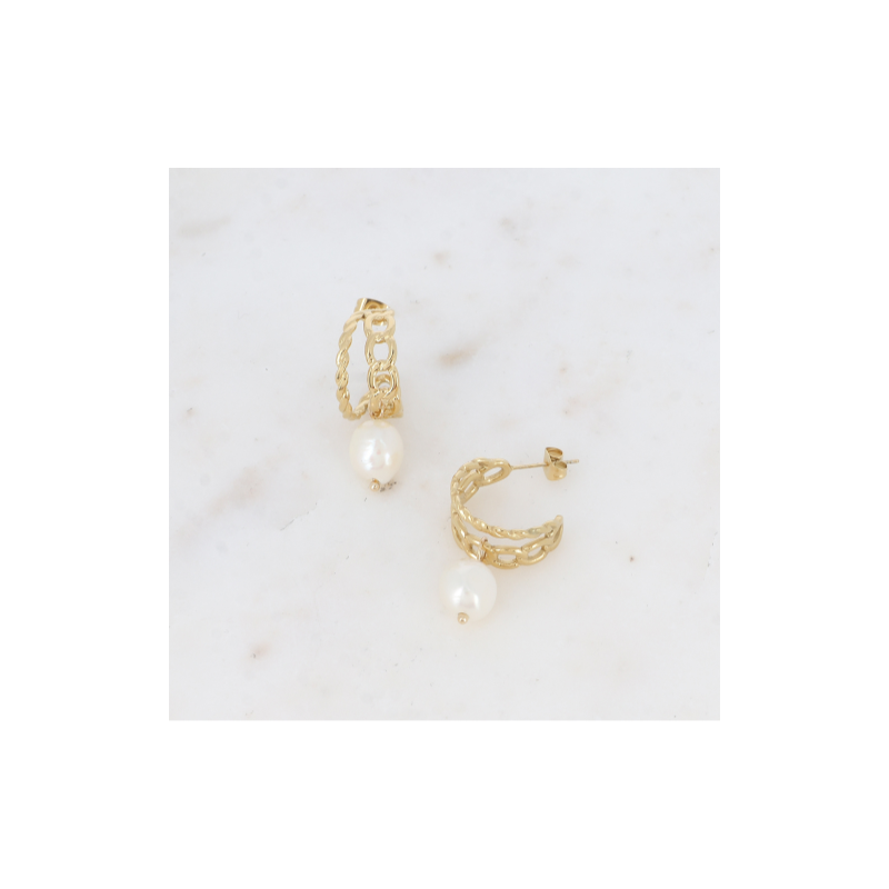 Boucles d'oreilles type créoles en acier inoxydable composées de 2 anneaux en forme de mailles, avec une perle d'eau douce pendante.