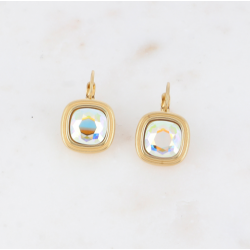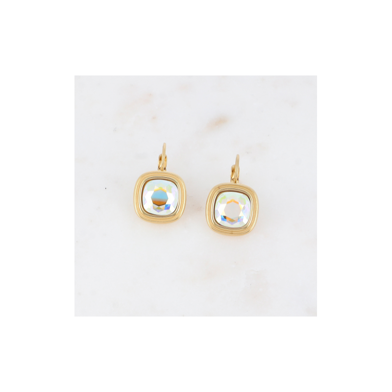 Boucles d'oreilles dormeuses en acier inoxydable composées de cristaux carrés.