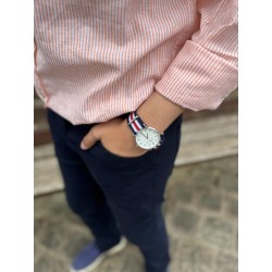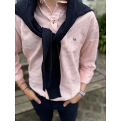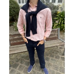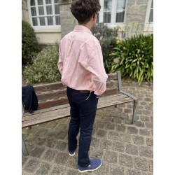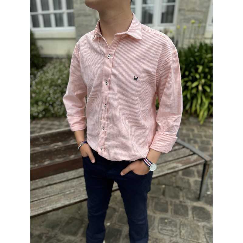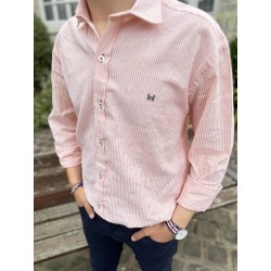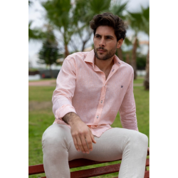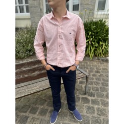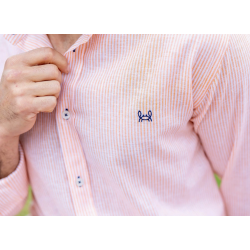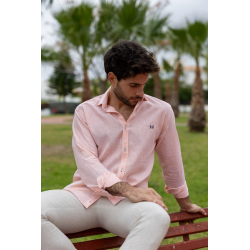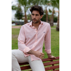 Chemise en lin à fines rayures saumon. Modèle Gijón. Coupe semi-ajustée, col italien. Composition : 50 % lin, 50 % coton.