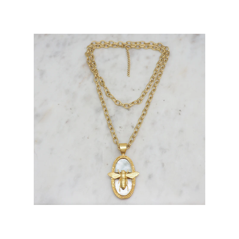 Sautoir en laiton doré à l'or fin de 90cm, sublimé par un délicat insert en nacre, apportant une touche lumineuse et irisée.