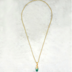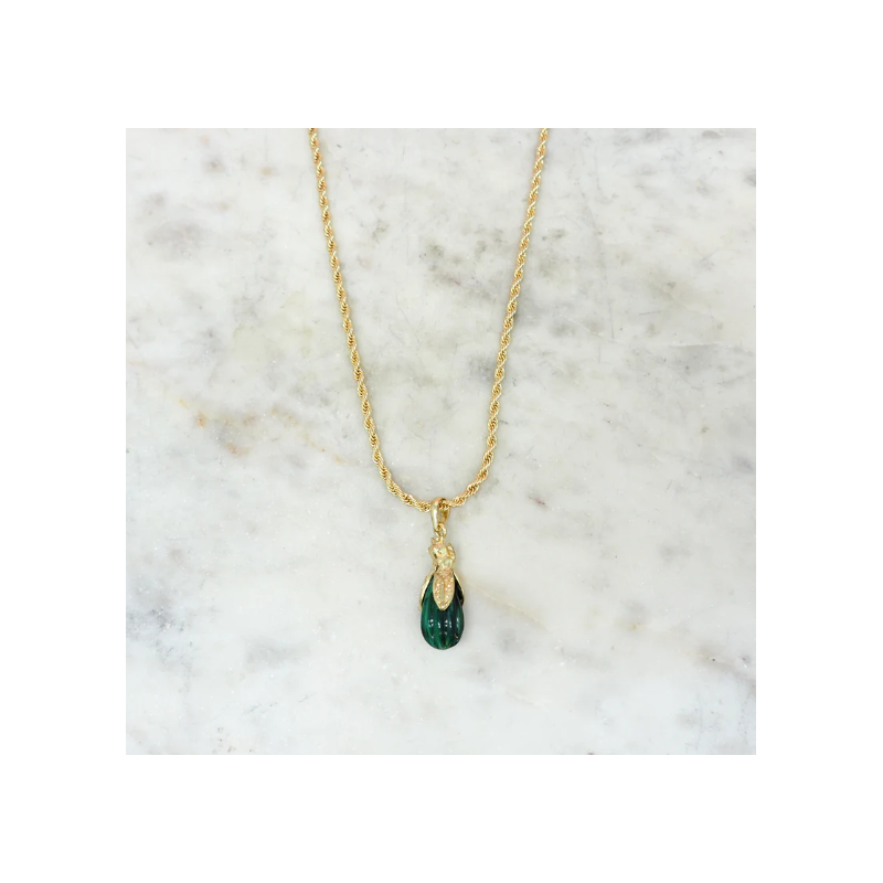 Ce sautoir en laiton doré à l'or fin 18 carats, façonée autour d'un motif Totem protecteur. Le pendentif est taillé dans une malachite naturelle, aux veinures profondes de vert, chaque pierre étant unique . Une création audacieuse qui associe symbolisme et sophistication.