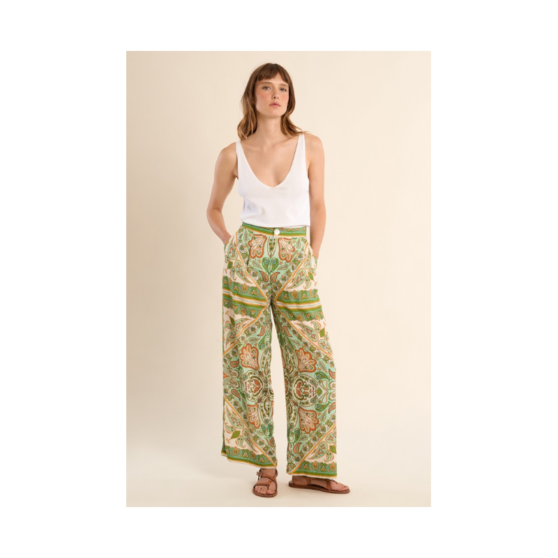 Pantalon fluide, imprimé foulard -Taille haute, coupe large -Effet satiné -Poches plaquées sur les côtés -Fermeture par bouton et zip