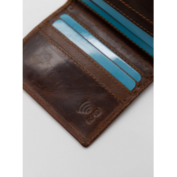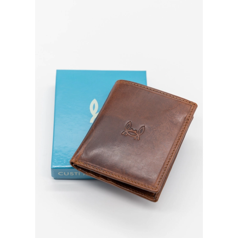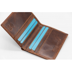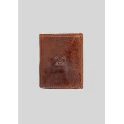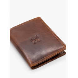 Portefeuille confectionné en 100 % cuir de vachette huilé. Il a une fermeture à bouton-pression. Il dispose de compartiments pour billets, cartes et pièces de monnaie. Logo gravé à l'extérieur et à l'intérieur.