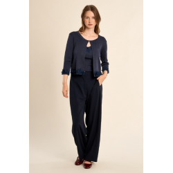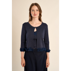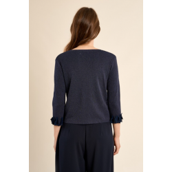 Cardigan court en maille irisée -Manches 3/4 finitions fantaisie -Encolure ronde -Fermeture par un bouton sous l'encolure -Coupe droite -Fleurs fantaisie