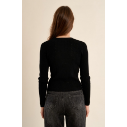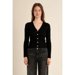 Gilet fin en maille -Coupe courte et ajustée -Manches longues -Encolure V -Fermeture par boutons contrastés sur le milieu devan