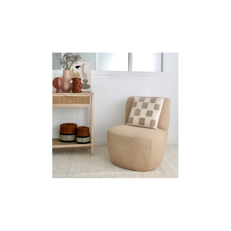 Dossier ergonomique, assise moelleuse, recouvert de tissu texturé bouclette. Le fauteuil Eve se glisse partout grâce à son petit format, tout en ne concédant rien au confort spécialement conçu pour les adeptes du slowlife. Ne nécessite pas de montage.