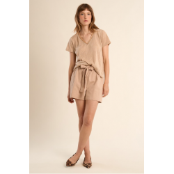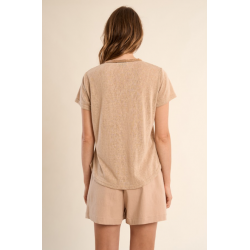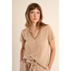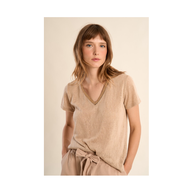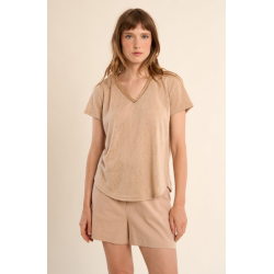 -T-shirt col V, doré -Manches courtes -Semi-transparence