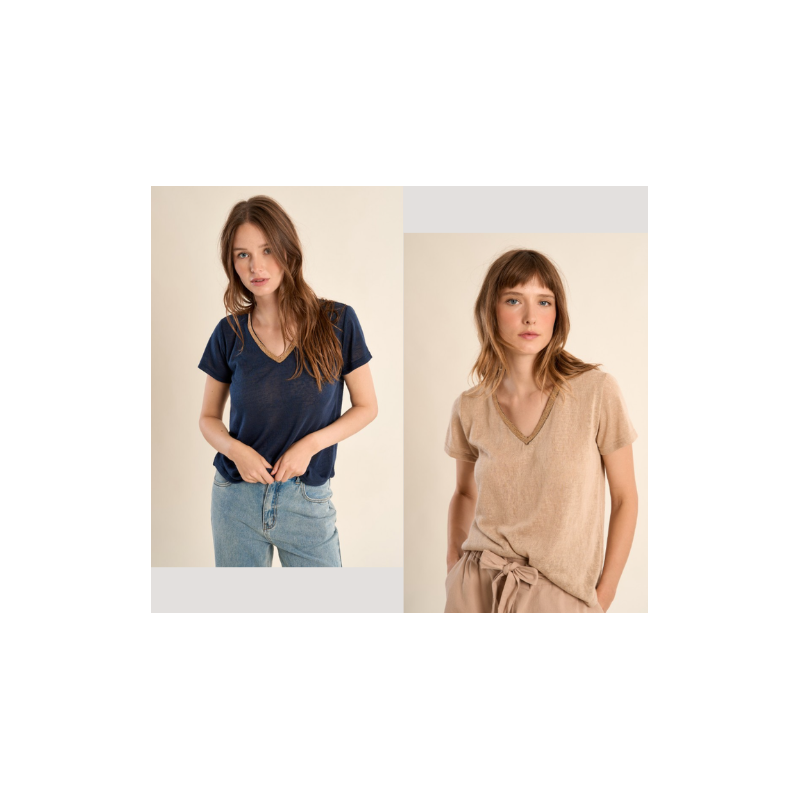 -T-shirt col V, doré -Manches courtes -Semi-transparence